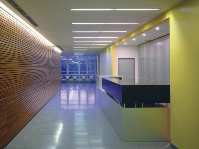 In der vorhandenen Stahlbetonstruktur eines Kaufhauses entstand auf zwei Etagen in der Dimension von 130 mal 35 Metern ein Klinikzentrum mit 17 verschiedenen Fachrichtungen, einem operativen Zentrum, einer Tagesklinik und einem stationären Bereich. Die einzelnen Arztpraxen und Stationen werden über ein gemeinsames Foyer im dritten Obergeschoss und lange Mittelflure erschlossen. Eine sterile Krankenhausatmosphäre sollte grundsätzlich vermieden werden. Ausgangspunkt war die Überlegung, die lineare räumliche Struktur durch Tageslicht zu gliedern. Die räumliche Organisation verfolgt darum, ausgehend vom Foyer beziehungsweise vom Zentrum, das Konzept einer inneren »Straße« mit angrenzenden »Häusern«. Verschiedene Holzverkleidungen, Aluminiumoberflächen und farbige Anstriche, verstärkt durch Vor- und Rücksprünge der einzelnen Boxen, rufen das Bild einer Reihung von Straßenfronten in Erinnerung. Aus der Glasrotunde innerhalb des Operationsbereichs fällt durch eine transluzente Glaswand Tageslicht bis auf die zentrale, dynamische Erschließungsachse. Ein weiteres belebendes Element bis in die kleinsten Untersuchungsbereiche sind die farbigen Arbeiten von Thomas Weil.